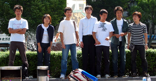 2002 年 7 月 26 日,第 20 回 九州分析化学若手の会夏季セミナー(大分県日田市)の帰り,日田駅前にて.左から椋本 晃介 (M2),上村 恵子 (M1),野島 高彦 助手,田窪 健 研究員,榊原 裕 (M1),高城 義幸 (M1),梶木 亮 (M1).