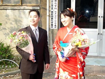 修士課程修了の別府剛治と玉利里奈.