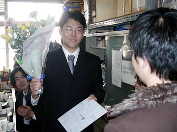 藤田智紀(修士修了)に梶木亮(M1)から花束贈呈.