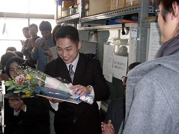 別府剛治(修士修了)に高城義幸(M1)から花束贈呈.