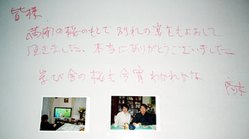 最終日,高木教授が研究室のホワイトボードに残されたメッセージと写真.「満開の桜のもとで別れの宴をもよおして頂きました.本当にありがとうございました.学び舎の桜も今宵わかれかな.高木」
