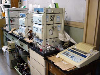 | 応化分子棟3階角に位置する部屋.竹中助教授の席がある.ペプチド固相合成,電気化学実験に用いられる電極の前処理,有機合成などが行われている.また,3台のHPLCが設置されており,各種生体高分子の精製に使用されている. | |