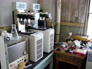 凍結乾燥機2セット設置.化学の実験室らしく,ガラス細工コーナーも一応残されているが,場所の有効利用の点から撤去は時間の問題.優先順位を付けて行かないと研究用設置面積が確保できない. |