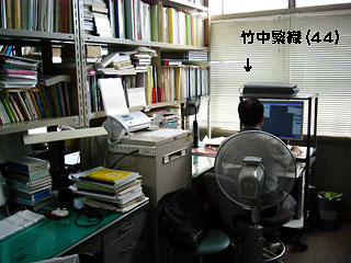 書棚で区切られた竹中助教授コーナー.「おまえら黙って俺の背中を見ろ」←なんて言ってません. |