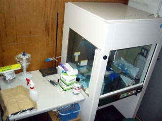 クリーンベンチと小型実験台.第五講座で最もクリーンな環境である.主としてRNA実験が行われている. |