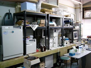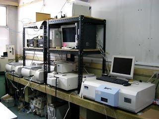 第五講座の測定室である.室内の扉を介して隣の309号室とつながっている.この2部屋と3名の実験アシスタントが「測定データ収集ハイスループット実験システム」を構成しており,これまでにここで多数の基礎研究データが収集されてきた.電源容量オーバーによるシャットダウンの危険性があるため,各自が適当に作業時間を分散させている.第五講座が学生にコアタイム無しのフレックスタイム制を敷いているのにはこのような理由もある. | |