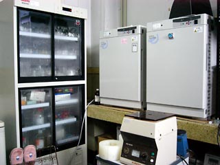 ![]() | 冷蔵庫とインキュベータと小型遠心機.測定室は土足厳禁なのでスリッパ着用. |