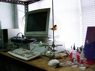電気化学実験装置一式.トータルで5セット設置.他に走査型電気化学顕微鏡なども設置.いちばん体積を占めているのは,実はPCだったりする.