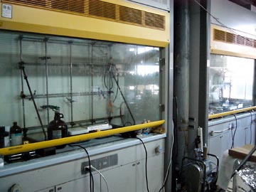 有機合成実験用ドラフト2セット.常に何かしらの反応が進行中.